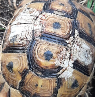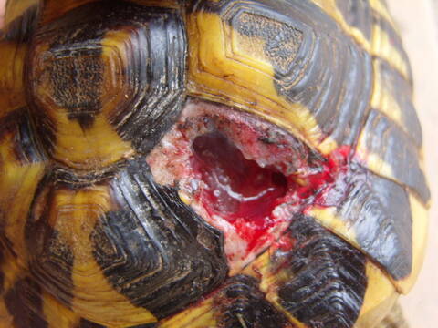 Si votre tortue est blessée, vous pouvez dans un premier temps désinfecter les plaies à la bétadine, la mettre au chaud sur un sol sans terre ( sopalin) pour éviter les bactéries, mettre un linge pour éviter les mouches et leurs larves et SURTOUT appeler votre vétérinaire NAC.